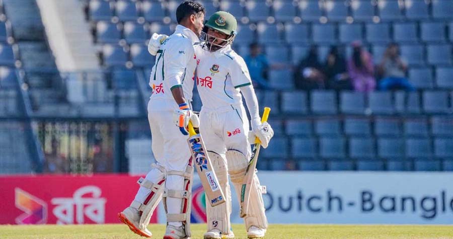 টেস্ট ক্যারিয়ারের দ্বিতীয় ও ঘরের মাঠে প্রথম শতকের দেখা পাওয়া জয় আছেন ডাবল সেঞ্চুরির পথে। ২৮৩ বলে ১৪ চার ও ৪ ছক্কায় ১৬৯ রান করে অপরাজিত আছেন তিনি। যা তার ক্যারিয়ার সেরা ইনিংস। এছাড়া অভিজ্ঞ মুমিনুল ১২৪ বলে ৫ চার ও ২ ছক্কায় অপরাজিত আছেন ৮০ রানে। ক্যারিয়ারের ১৪তম সেঞ্চুরির অপেক্ষায় আছেন সাবেক এই অধিনায়ক।