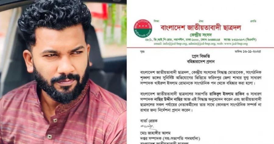 সংবাদ বিজ্ঞপ্তিতে বলা হয়েছে, ছাত্রদলের কেন্দ্রীয় সংসদের সিদ্ধান্ত মোতাবেক, সাংগঠনিক শৃঙ্খলা ভঙ্গের সুনির্দিষ্ট অভিযোগের ভিত্তিতে ফরিদপুর জেলা শাখার যুগ্ম সাধারণ সম্পাদক খাইরুল ইসলাম রোমানকে সাংগঠনিক পদ থেকে বহিষ্কার করা হয়েছে। ছাত্রদলের সভাপতি রাকিবুল ইসলাম (রাকিব) ও সাধারণ সম্পাদক নাছির উদ্দীন (নাছির) আজ এই সিদ্ধান্ত অনুমোদন করেছেন। ছাত্রদলের সব পর্যায়ের নেতা–কর্মীদের খাইরুলের সঙ্গে কোনোরূপ সাংগঠনিক সম্পর্ক না রাখার জন্য নির্দেশনা দেওয়া হয়েছে সংবাদ বিজ্ঞপ্তিতে।