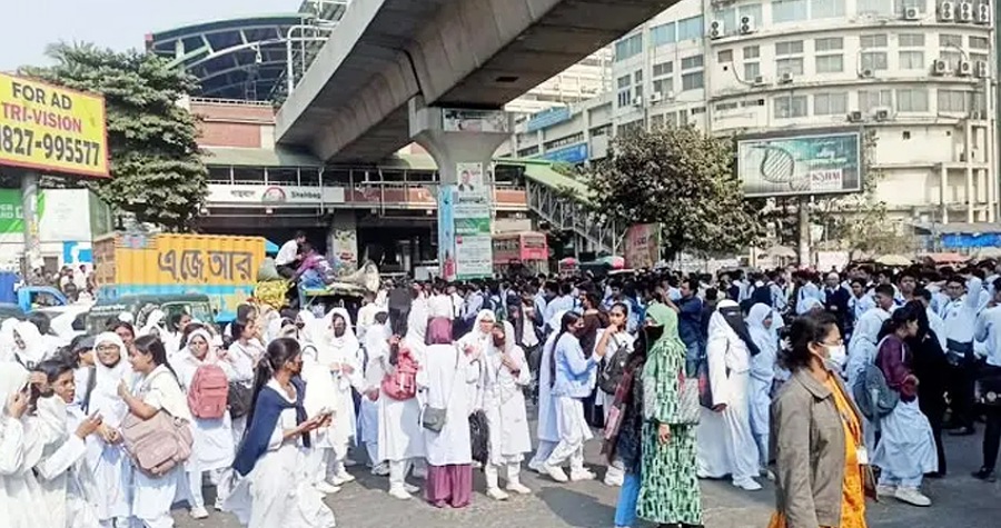 প্রস্তাবিত ‘ঢাকা সেন্ট্রাল ইউনিভার্সিটি’র স্কুলিং মডেল ভিত্তিক খসড়া অধ্যাদেশ ইস্যুতে রাজধানীর শাহবাগ মোড় অবরোধ করেছেন পাঁচ সরকারি কলেজের উচ্চমাধ্যমিক শ্রেণির শিক্ষার্থীরা।