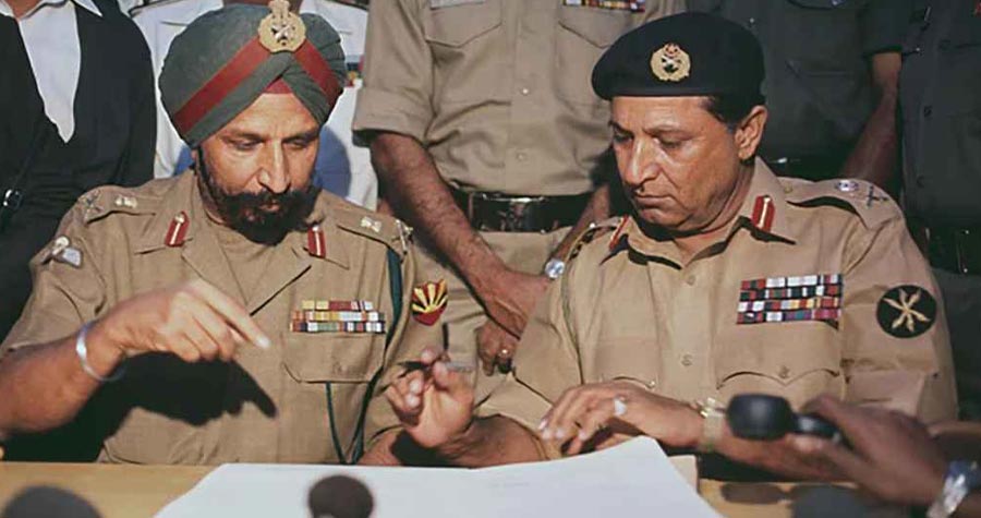 ১৯৭১ সালের ১৬ ডিসেম্বর আত্মসমর্পণের দলিলে সই করেন পাকিস্তানি বাহিনীর পূর্বাঞ্চলীয় কমান্ডের অধিনায়ক লে. জেনারেল এ এ কে নিয়াজি (ডানে)। তার পাশে মিত্রবাহিনীর লে. জেনারেল জগজিৎ সিং অরোরা।