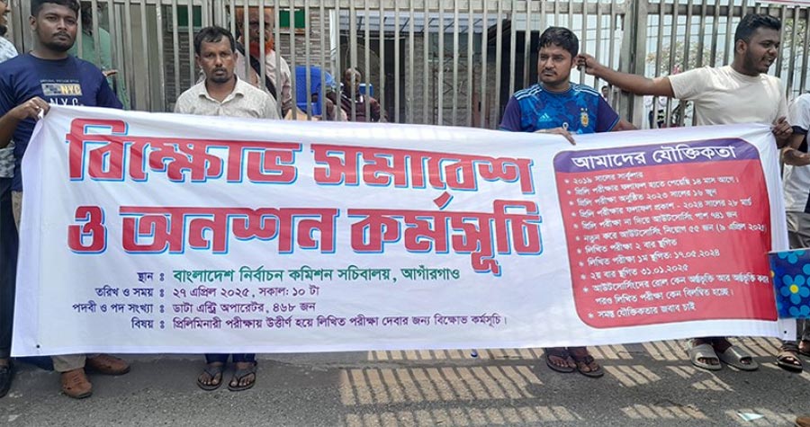 ডাটা এন্ট্রি অপারেটর পদে প্রিলিমিনারি পরীক্ষায় উত্তীর্ণ প্রার্থীরা লিখিত পরীক্ষার দাবিতে নির্বাচন কমিশন (ইসি) ভবনের সামনে বিক্ষোভ করছেন।
