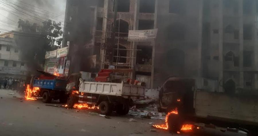 পৌরসভার স্যানেটারী ইন্সপেক্টর মো. উমর ফারুক জানান, ‘নতুন বাজার এলাকায় মুক্তিযোদ্ধা সংসদ ও হকাররা পৌরসভার জায়গা দখল করে দীর্ঘদিন ধরে অবৈধ স্থাপনা নির্মাণ করে ব্যবসা পরিচালনা করছে। বার বার নোটিশ দেয়া সত্ত্বেও তারা এসব স্থাপনা সরায়নি। অবশেষে নোটিশের সর্বশেষ তারিখের বেশ কয়েকদিন পর শনিবার ওইসব স্থাপনা ভেঙে দেয়া হয়। এতে জেলা মুক্তিযোদ্ধা সংসদের আহ্বায়ক মাহফুজুর রহমানের নেতৃত্বে হকাররা পৌরসভার তিনটি ময়লা বহনকারী পিকআপভ্যানে আগুন ধরিয়ে দেয়। এ সময় পৌর কর্মচারীদের সঙ্গে দখল বাজদের বাগবিতাণ্ডা ও হাতাহাতি হয়। একপর্যায়ে স্থানীয় লোকজন ও ফায়ার সার্ভিস এসে আগুন নিয়ন্ত্রণে আনে।’